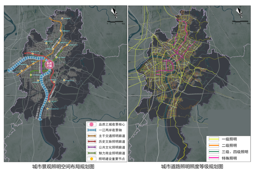 在城市景观照明空间布局上,规划构建“一核、一轴、多廊、多点”的城市景观照明空间布局,对各点的灯光要求进行明确。